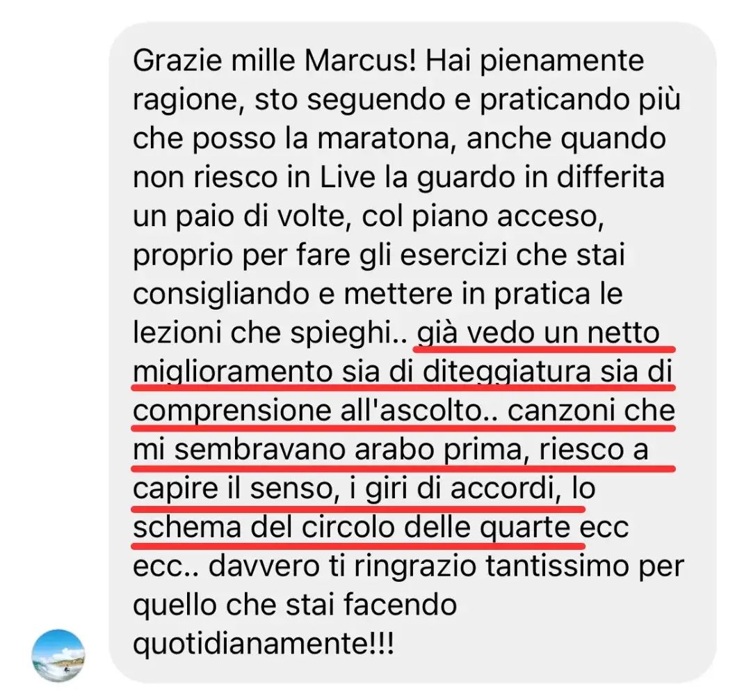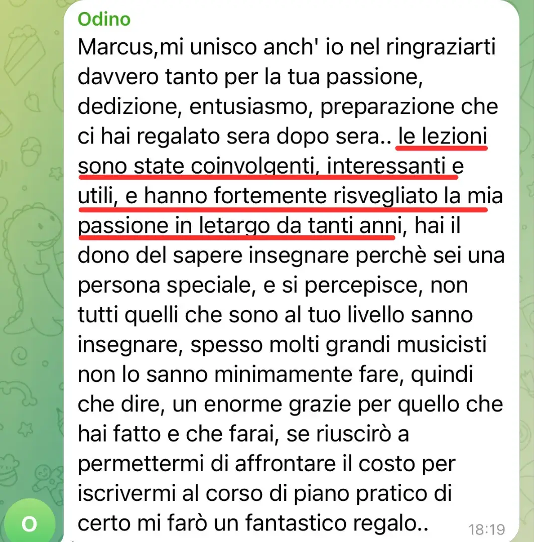 Marcus è un pianista diplomato in Brasile, con una formazione avanzata a Torino, caratterizzato da un percorso artistico di rilievo internazionale. Dal 2018, è il fondatore di 'pianopratico.it', dove si dedica all'insegnamento online del pianoforte, raggiungendo migliaia di studenti in tutto il mondo. La sua metodologia didattica è rinomata per essere intuitiva, accessibile e personalizzata, adattandosi efficacemente alle esigenze di ogni discepolo, dai neofiti ai più esperti. Le numerose recensioni positive sui social media testimoniano il suo impegno e la sua abilità nell'infondere non solo competenze tecniche, ma anche una profonda passione per la musica.